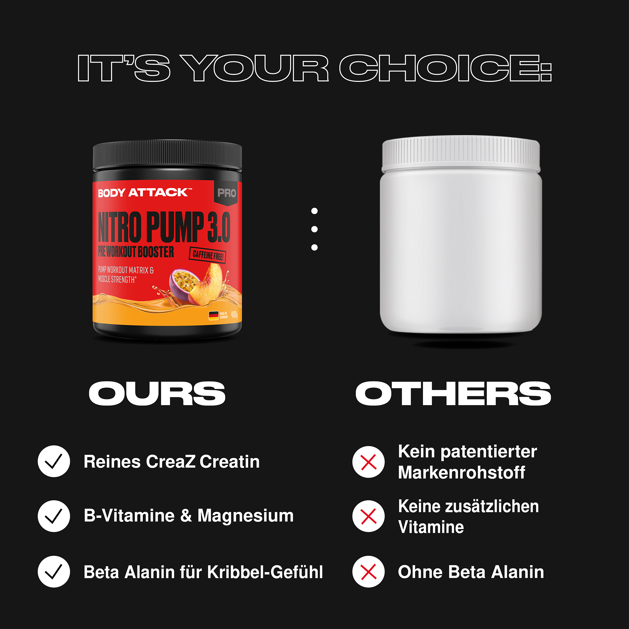 Du suchst einen Trainingsbooster ohne Koffein, der dich trotzdem so richtig nach vorne bringt? Sollst du haben! Der Pre Workout Booster NITRO PUMP 3.0 sorgt mit einzigartiger Nährstoff-Matrix für den ultimativen Support deiner Muskeln. Die wissenschaftlich belegte, positive Wirkung des zu 100 % reinsten und stärksten Kreatin CreaZ® ist dein Brennstoff, um mehr Kraftleistung abzurufen. Das in dem Booster enthaltene Beta Alanin sowie B-Vitamine und Magnesium bringen dich auf Spur. Damit du deine beste Leistung abrufen. Dabei verzichten wir auf Aspartam und setzen auf vollen, köstlichen Geschmack. Pflanzenextrakte, Aminosäuren und Taurin machen die wirkungsstarke Formel komplett. Worauf wartest du noch? Drück auf’s Gaspedal und gib deinem Körper den Nitro-Treibstoff, der dich auf die Pole-Position bringt!