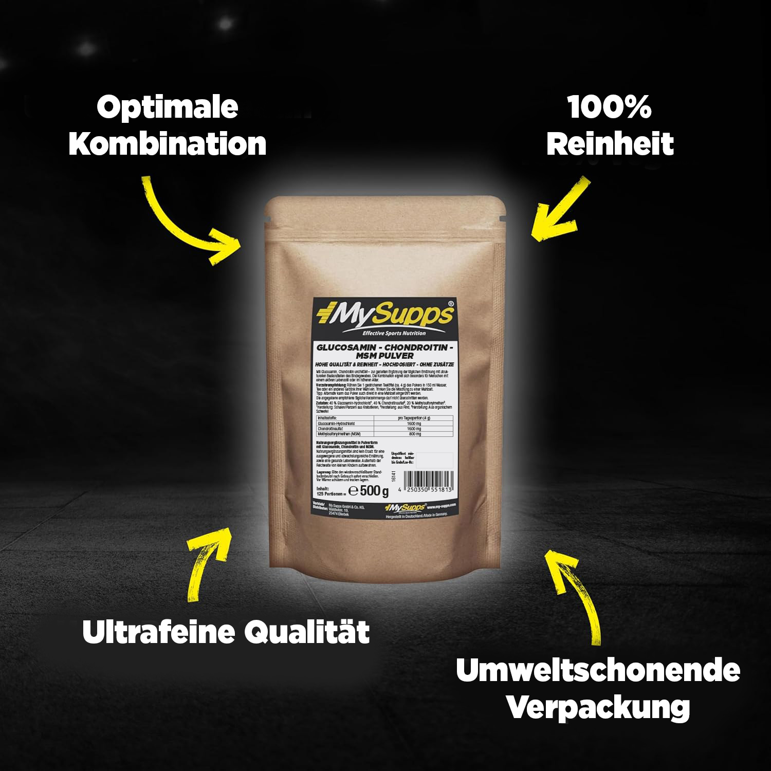 Dein natürlicher Schwefelhaushalt benötigt einen Boost? Dann hast du deinen idealen Partner gefunden! Das Glucosamin Chondroitin MSM von Body Attack liefert dir hochwertiges Methylsulfonylmethan, Glucosamin und Chondroitin Pulver mit hoher biologische Verfügbarkeit. Das Glucosamin Chondroitin MSM Pulver ist ideal zur gezielten Ergänzung der täglichen Ernährung mit strukturellen Bestandteilen des Bindegewebes. Die Kombination eignet sich besonders für Menschen mit einem aktiven Lebensstil oder im höheren Alter.