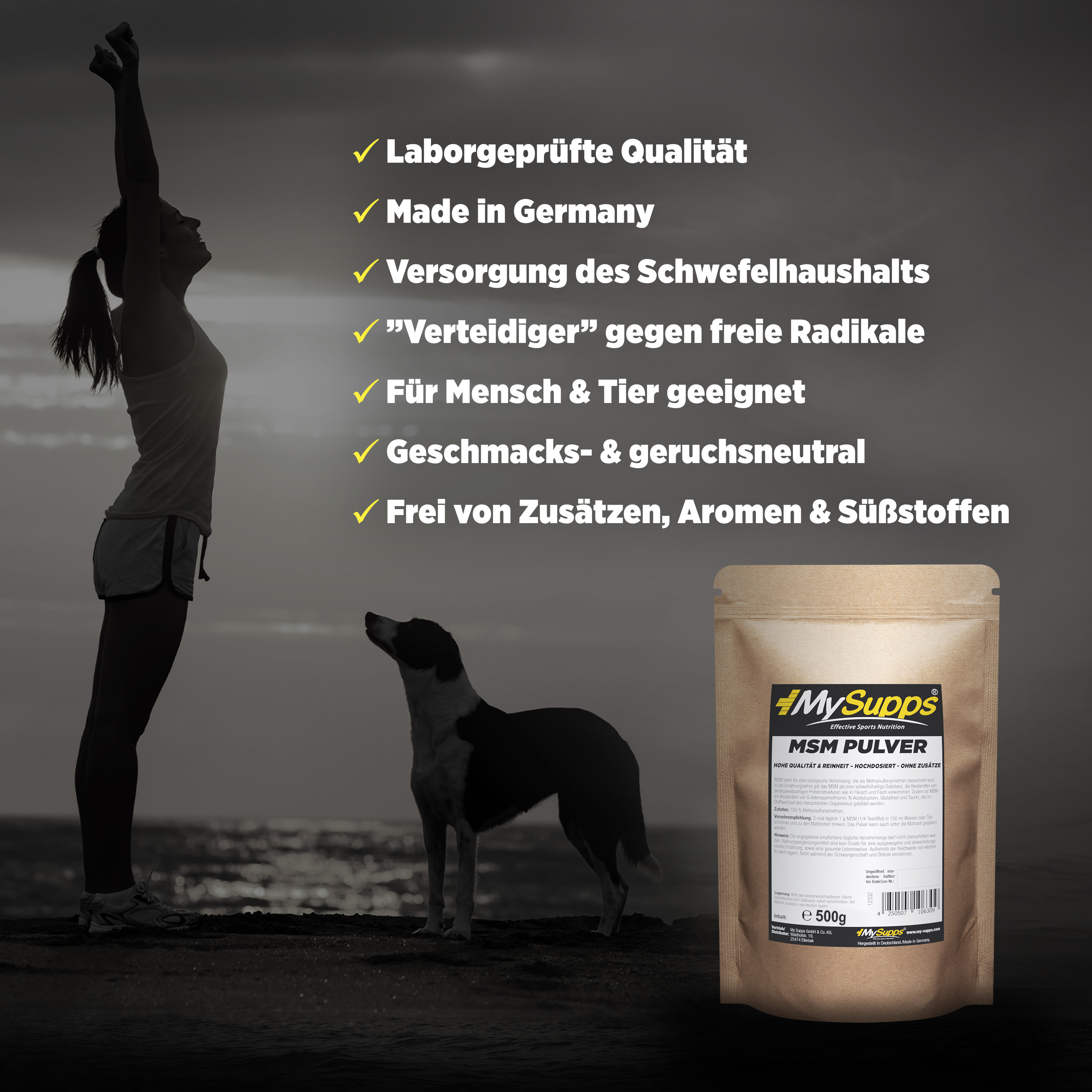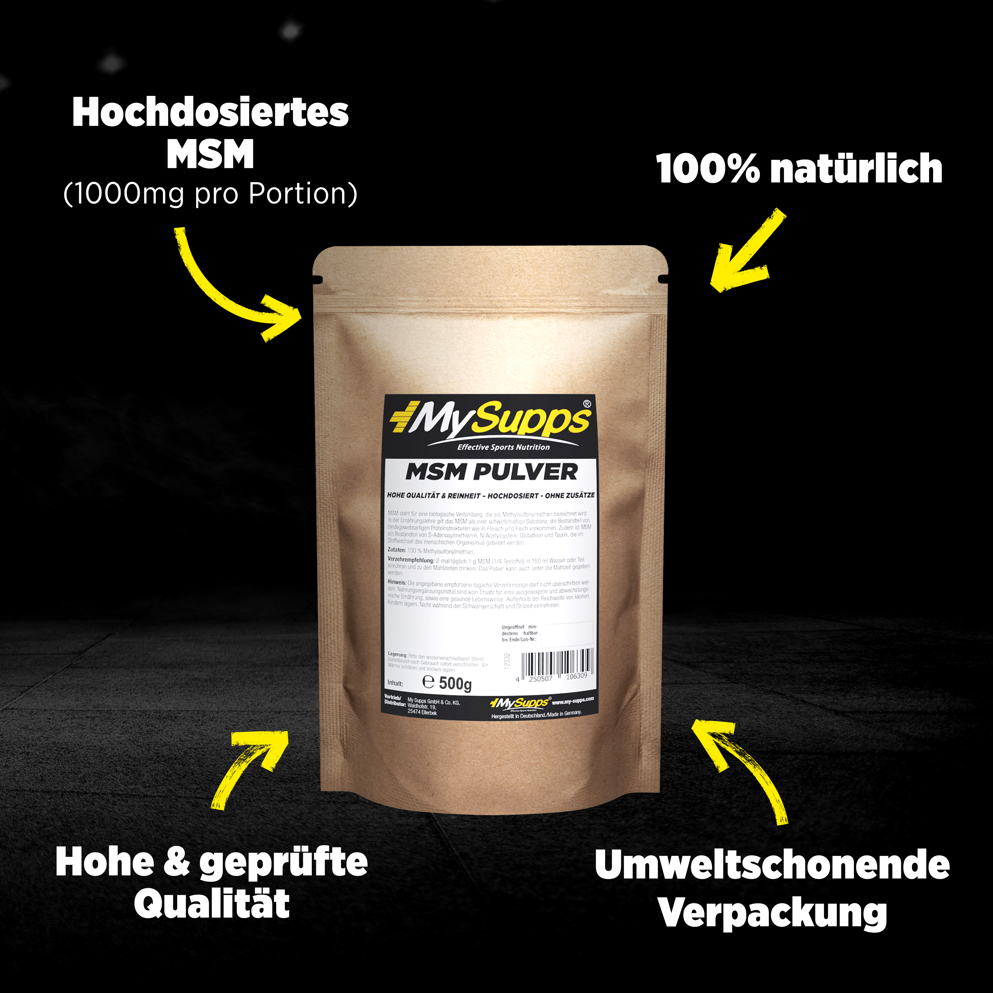 Du bist auf der Suche nach dem optimalen Boost für deinen natürlichen Schwefelhaushalt? Don´t worry! Kriegen wir hin! Mit dem unvergleichlich reinen und biologisch wertvollem MSM von My Supps bekommst du hochwertiges MSM Pulver frei von Zusätzen, Zucker, Süßstoffen oder sonstigem Schnickschnack! Eben ein Monoprodukt, einfach dein Supplement, einfach My Supps.